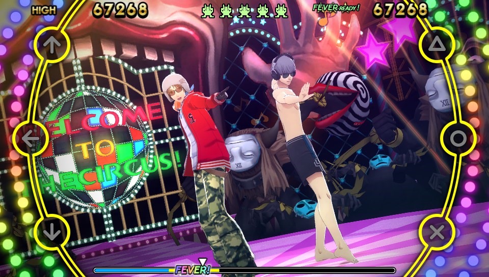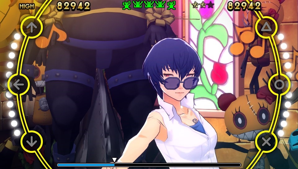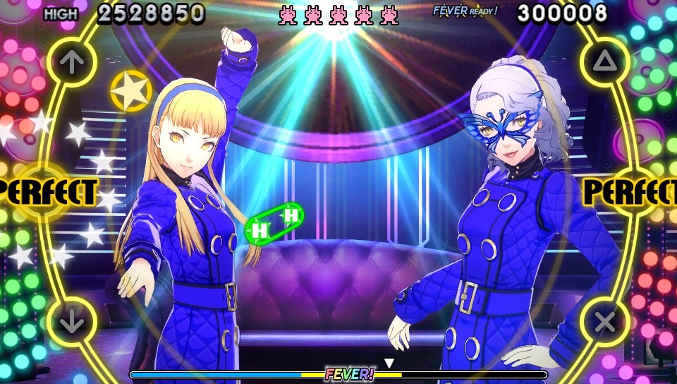 Persona 4: Dancing All Night is relying on such nostalgia and muscle memory. After all, the layout is rather unconventional for a music game. Notes begin in the center of the screen, perhaps to keep players focused on the iconic characters, then drift outward to up, left, down, triangle circle, and cross indicators on an outer circle. Focusing attention on where the icons are supposed to go is a good way to fail, especially on Hard or All Night difficulty levels. The game wants you to already know where everything is and rely on familiarity with the songs to get the timing right.