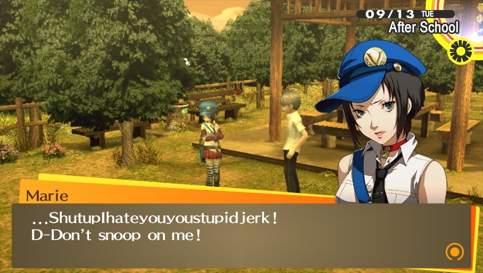 p4g_screens_firstenglishbatch_01 Persona 4: Golden begins almost exactly like the PlayStation 2 game. You, a gray-haired teen from the city, hop on a train to Inaba. Your uncle Dojima, a police officer, and jingle loving cousin Nanako are waiting at the station to pick you up. For the next year, this rural town is your home. The protagonist (we’ll call him Yu like in Persona 4 Arena) bumps into Marie, a new character made for the Vita version, who insists your dropped something.   p4g_screens_adayinthelife_withmarie   When Marie is in the Velvet Room she can power up your personas with skill cards, another new element in Persona 4: Golden. Skill cards let you customize a persona by bestowing abilities like Agi (that’s a fire spell) or Media (healing magic). You get skill cards from Shuffle Time and you can either use them or give them to Marie so she can duplicate them for a fee. If you see Marie in town you can start the Aeon Social Link. Marie is confused about the “real world”, riddled with teenage angst, and tends to rambleinsultsinlongsentences. Yu can also spend time with Tohru Adachi, Dojima’s bumbling and loose lipped underling, and develop the Jester social link. These social links are tied to a handful of new for Persona 4: Golden personas that weren’t in the original game, but were in Persona 3. Gurr, Sati, and Narcissus are some of the personas Atlus added to Persona 4: Golden.   Social links? Personas? What are we talking about? For those of you that missed Persona 4, it’s a dungeon RPG meets dating sim hybrid wrapped in a murder mystery. Someone is throwing people into the TV World where enraged Shadows kill them on foggy days. Victims appear on a mysterious program called the Midnight Channel and the Investigation Team led by Yu vows to save them before the weather changes. When you’re not wearing snazzy glasses and wandering through steamy bathhouses, you are an ordinary teenager). Persona 4: Golden brings players back to high school – pop quizzes included. You pass the days developing personal stats like Yu’s knowledge by going to the library or hang out with friends to build social links. Social Links infuse personas with a surge of experience points and new for Persona 4: Golden additional skills for your teammates.