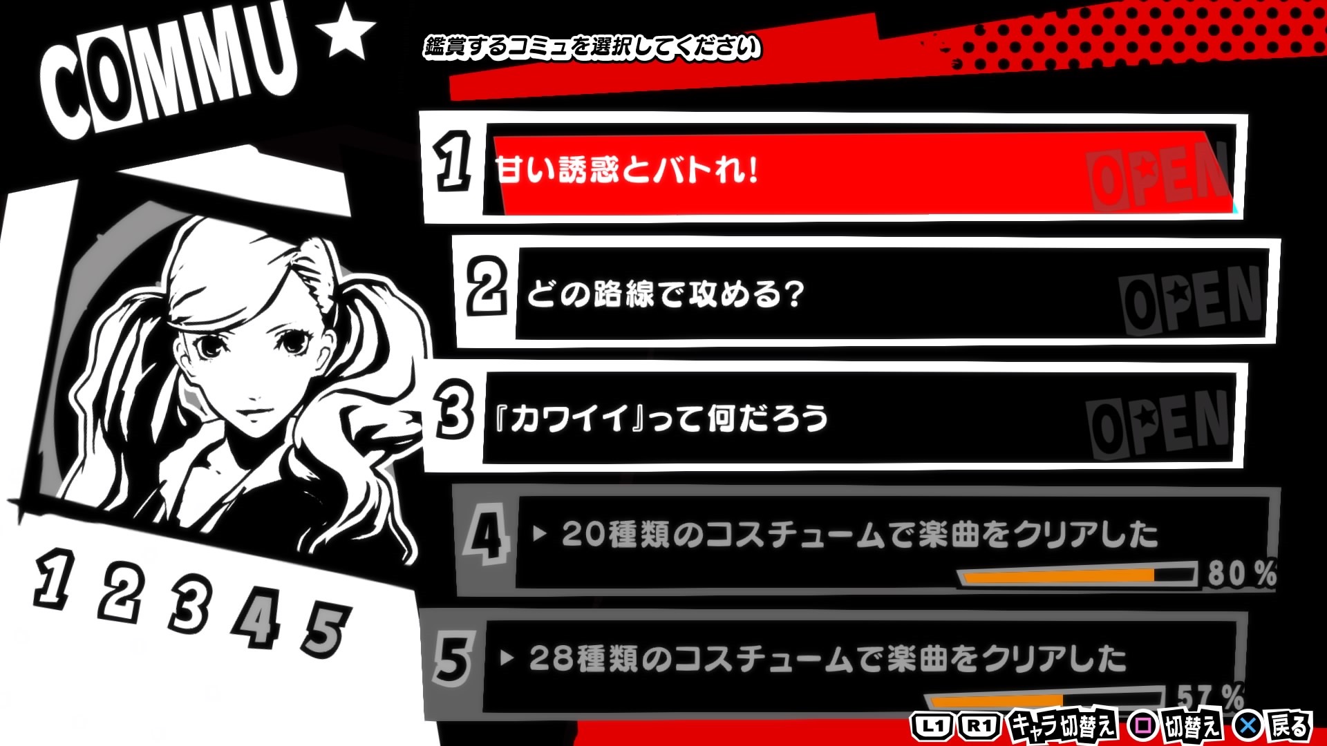 At least for characters, it is easy to help. Ryuji’s eight conversations require you to get cumulative max combos, with the first requiring 800 and the last needing 17,000. Morgana’s mostly require you to unlock challenges, but the sixth and eighth ranks require you to have three and five challenges applied to a song you have cleared. Ann is tied to costumes, with you applying one costume for her first event and needing to have cleared songs with 70 different costumes for her final conversation. Yusuke demands perfection, and you have to gotten over 1,000 Perfect cumulative notes for his first event, with his final event unlocking after 20,000 cumulative Perfect notes have been accrued. Makoto is a bit odd, as her first conversation requires you to have one support set for a song, then you have to clear songs with 5, 10, 15, and 20 accessories. After that, you have to set every support for a song you clear, and the final two conversations require 30 and 50 accessories. Futaba wants you to play music, with her first event opening after you have played three songs and her last showing up after playing songs 57 times. Haru cares about Brilliant ratings on songs, which comes if you clear it with only perfect and great notes. You need to get five Brilliants for her first event, and eventually earn 47 Brilliants for her eighth. Finally, Caroline and Justine’s segments unlock after you earn other people’s Commu segments, with the first open right away and the last showing up after you see 47 other events.