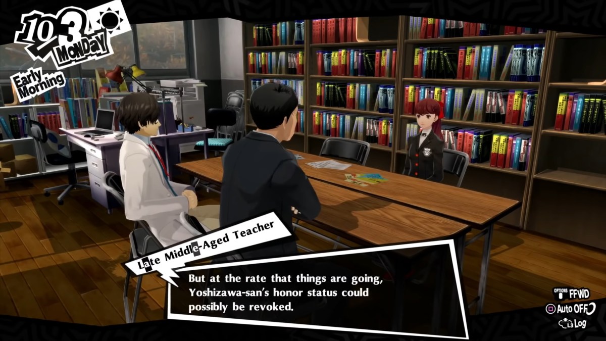 Even before you meet her, Yoshizawa ends up influencing Joker and the player. In the game’s introductory segment, it hints that she’ll play a major part, as her and Joker made a promise. But, it also suggests she doesn’t exactly condone of the Phantom Thieves’ behavior, as she points out she isn’t one of them. We see this idea mirrored in Joker’s earliest days at Shujin. They are two ships passing in the night. They are friendly and sociable with one another, but Kamoshida points out how she shouldn’t associate with “him.” We’re presented with the idea that Yoshizawa is a good girl, one who’s somewhat idealized and favored.
