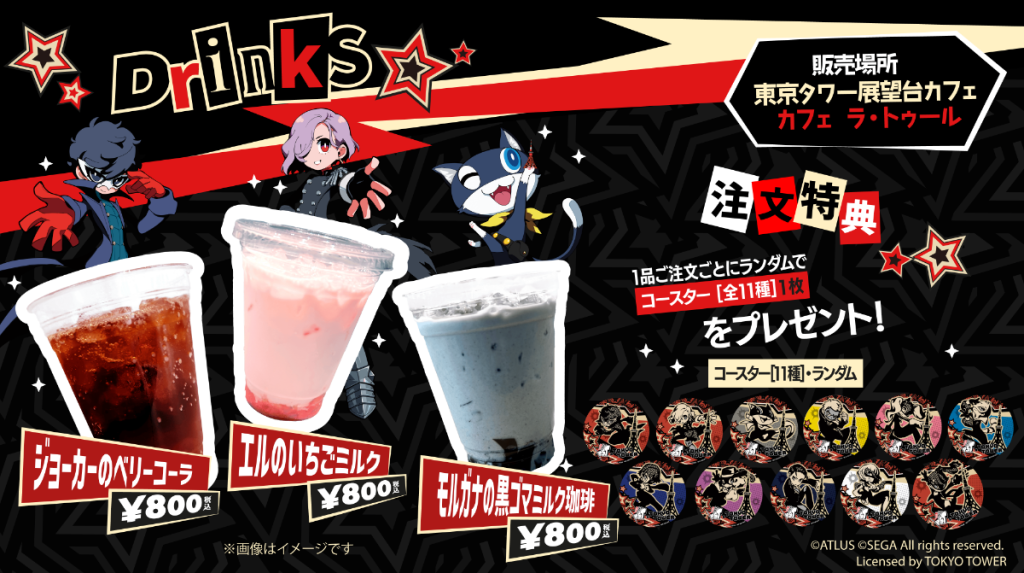 The observatory deck’s Cafe La Tour will also sell Persona 5 Tactica-themed drinks. For 800 yen, visitors can purchase Joker’s Berry Cola, Erina’s Strawberry Milk, or Morgana’s Black Sesame Milk Coffee with a random coaster mat featuring chibi artwork of one of the game’s characters.
