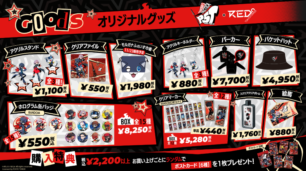 The RED° Mart will also sell various Persona 5 Tactica merchandise ranging from clear files at 550 yen (~$4) to parka hoodies at 7,700 yen (~$51). For every purchase of 2,200 yen, visitors will receive an additional random postcard.