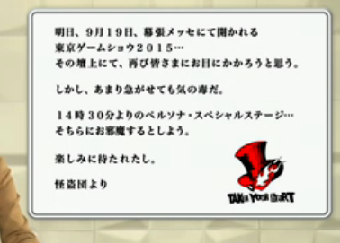 2015-09-18_072135 Following the troublemaker Ryuji Sakamoto and heroine Anne Takamaki, the character profile investigations by Atlus has reached its end, with a look at Morgana, who still remains full of mysteries.   Morgana (CV: Ikue Otani):   2015-09-18_072953 2015-09-18_070313 Morgana is the most mysterious one of all the phantom thieves. Morgana’s height is close to that of a child’s, and while she may look like a cat, nobody knows what she actually is. She also seems to be wearing a mask at all times…   That’s pretty much all the information they were able to get about Morgana in these character profile “investigations.” However, they say that she’s often seen together with the character that appears to be the leader (protagonist). It also mentions that black cats and shadows have similarities…   2015-09-18_070203 During the special broadcast on Atlus’ NicoNico Live channel, a certain Phantom Thief left a message for the reporter, saying that they will visit the Makuhari Messe, where Tokyo Game Show is being held.   This Phantom Thief will appear at 2:30pm JST during the Persona Special Stage event, and says to look forward to it. This will be the second time that this mysterious Phantom Thief appears at a Persona event, with the last time being his appearance at the Nippon Budokan, which was teased by a message on the Japanese newspaper,  Yomiuri Shimbun.   Persona 5 will release in Japan in Summer 2016 for PlayStation 4 and PlayStation 3. The game will release in 2016 for North America. You can check out more of Morgana and the others in the game’s Tokyo Game Show 2015 trailer, here.