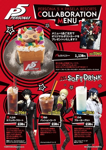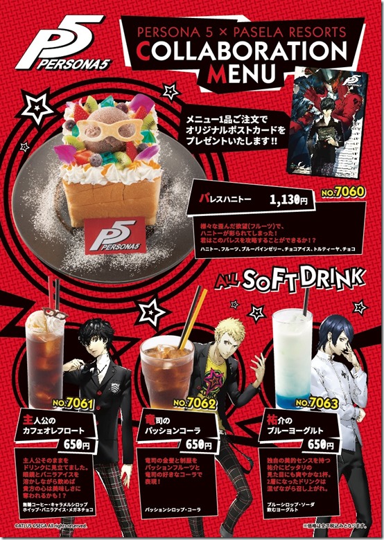 An original postcard is also included with each menu item. The above image also shows us a few more, with the Palace Honey Toast, Protagonist’s Café au Lait Float, Ryuji’s Passion Cola, and Yusuke’s Blue Yogurt. The limited time collaboration cafe will run from October 14 through November 23, 2016 at the Pasela Resorts Shibuya Shop 2F Los Cabos. Persona 5 is available in Japan for PlayStation 4 and PlayStation 3. The game releases in North America and Europe on February 14, 2017.