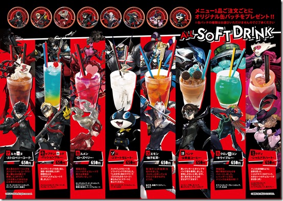 Next on the menu is a look at some soft drinks that are based off the Phantom Thieves and their Personas. We have Aresene Strawberry Coke, Captain Kidd Passion Blue, Carmen Roseberry, Zorro Smart Mojito, Goemon Iced Citron Tea, Johanna High Priestess Coffee, Necronomicon Kiwi Blue, and Milady Chardonnay Heart.