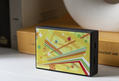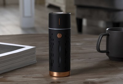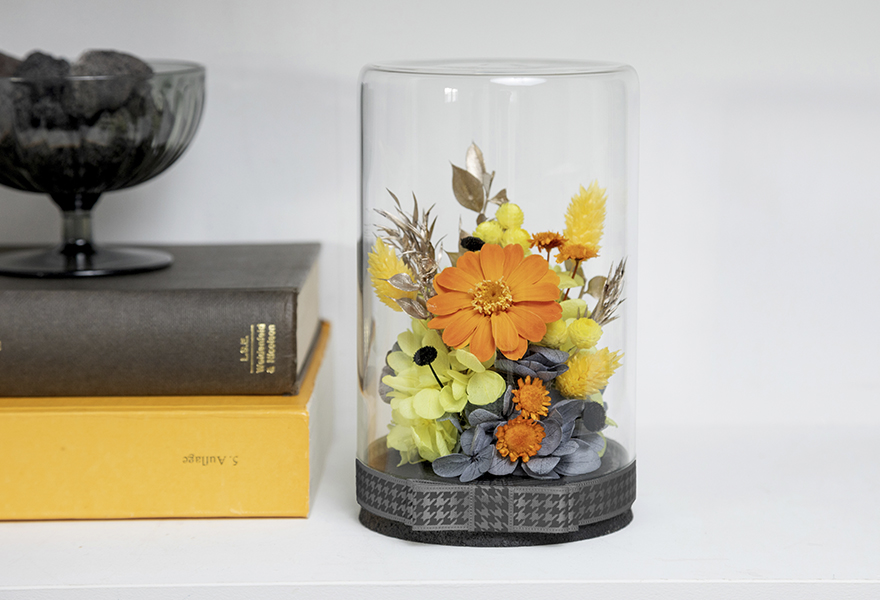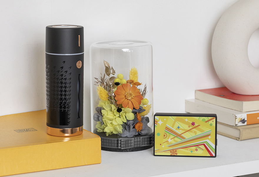 Persona 4 Golden follows the dominant yellow coloration of the game, with rainbow-like stripes to recreate the game’s distinctive menu theme. A TV logo is printed on the face of the wireless speaker to signify the Midnight Channel. The flower arrangement includes orange daisies and yellow flowers, backed by gray and black-colored plants to evoke the tone of the Yasogami High school uniforms. The Humidifier’s pattern also copies the pattern found on Yasogami’s uniform collars and skirts. It sports a golden badge of a pair of glasses, recalling the spectacles