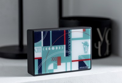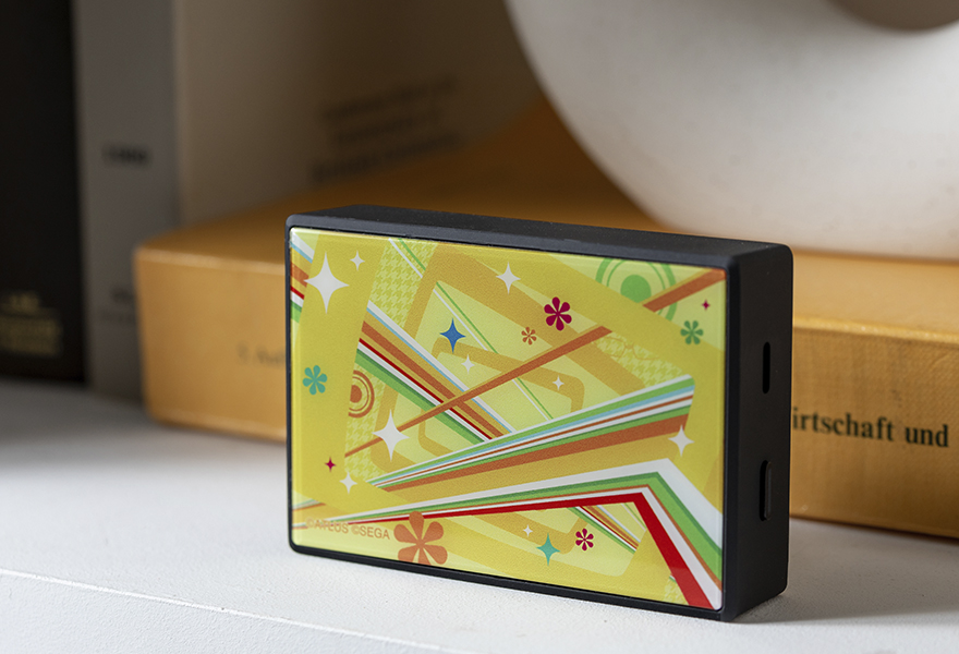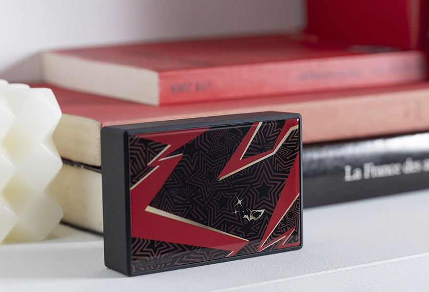 The Phantom Thieves, Investigation Team, and S.E.E.S. entered a new field: interior design. Atlus partnered with Useless Use Lab to create a new line of Persona decor items for fans’ homes. Useless Use Lab is a lifestyle brand focused on designing character goods for interiors and decorative purposes. The Persona decor line encompasses three sets of items themed after Persona 3 Portable, Persona 4 Golden, and Persona 5 Royal. Each set consists of three items: A decorative bottled flower arrangement, a wireless speaker, and a desktop humidifier. Each set has unique coloration and custom patterns themed after the visual style of their respective game. Each item is sold separately for 5,500 Yen each (about $42 USD), putting the price of a full set at 16,500 Yen (about $127 USD). The Persona 3 Portable decor set emphasizes the blue and white color scheme of Persona 3, as well as its signature pattern of squares and circles in random arrangements. The humidifier is patterned this way in monochrome, with badge on the side shaped like a SEES Evoker pistol. The bottled flower features blue roses and a blue-black ribbon, and the speaker is printed with patterns reminiscent of the game’s animated intro, with a SEES logo on the other side.