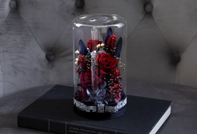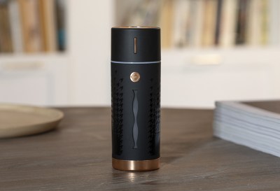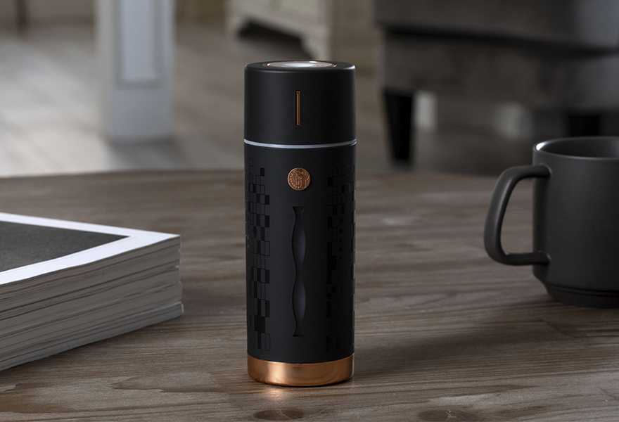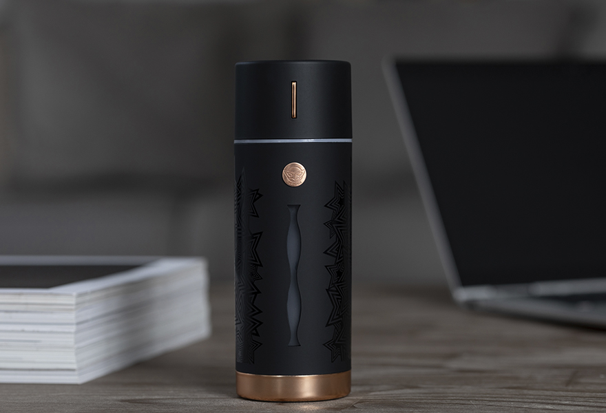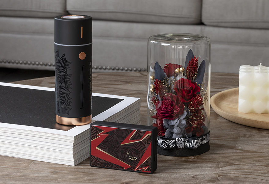Persona 5: red, black, and white, with concentric star patterns. Red roses and black leaves stand out beside the monochrome ribbon wrapping the bottled flower display. The speaker uses jagged red streaks to interrupt the star pattern and draw attention to Joker’s mask. The Phantom Thieves’ logo is also printed on the speaker face. The humidifier is printed with the concentric star pattern, and its badge also recalls Joker’s thief mask.