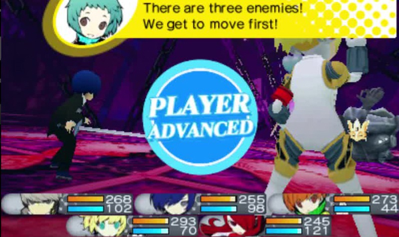 By and large I think that these changes are for the best. These are changes that smooth the basic Etrian Odyssey formula without removing anything that makes it fun. There are a few things that I found to go too far, though. I really don’t need a character pointing out every time I walk by a treasure chest or a secret passage. And warning me after every single battle when someone got low on health? That’s downright condescending. I’m not blind; these things are clearly visible and I’ll take care of them myself. Ultimately, though, these are small presentational quibbles, and if they really bug you there’s nothing stopping you from just turning off the voices in the options like I did. Player babysitting aside, once you’re inside a dungeon this is a rock solid Etrian Odyssey-style spelunking experience. The dungeons look great for one thing—the surprisingly accomplished 3D engine Atlus rolled out for Etrian Odyssey IV looks better than ever here, and for once, the environments being rendered aren’t just fantasy staple settings. Some of the dungeons look downright trippy and are influenced by the artistic style of the Persona games in the best way. The combat is the game’s greatest triumph, though. Etrian Odyssey has never had bad combat, but it’s always been very straightforward. It’s a blank sheet of paper on which the player’s decisions and customized characters play out to paint harrowing pictures of close escapes and triumphs against overwhelming odds. Persona Q by comparison doesn’t give the player nearly as much control over the party (characters level up gaining predetermined stats and abilities just like in Persona), but has a more dynamic set of systems within the combat screen.
