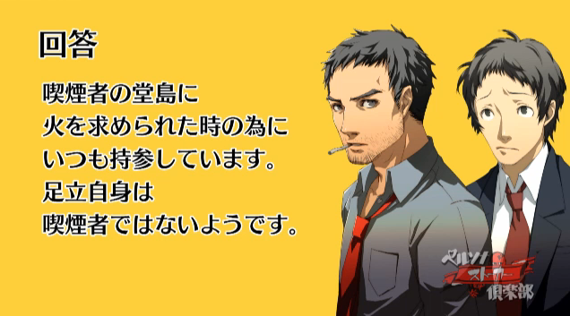 …only to have Matsumoto and his “chocopan” from the previous episode make another appearance. He can’t seem to get enough of those! Adachi’s voice actor Mitsuaki Madono does shows up as episode 5’s special guest, though, and they share a few Adachi facts, such as one fan mentioning that Adachi’s hobby is to do maintenance on his revolver gun, but as it turns out, since he can’t take home the one he owns, he actually likes to do maintenance on model guns at home. One fan asks if Adachi is a smoker, since there was that one scene, where he’s shown with a lighter in his pocket. Madono points out that he is never shown smoking, but as it turns out, it’s something he keeps with him at all times to light Dojima’s cigarettes.