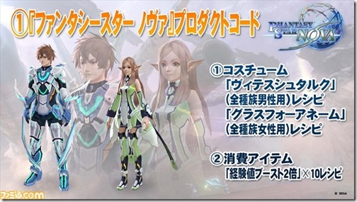 Finally, the third set is an item code that hooks you up with various things that can be used in Phantasy Star Online 2, like the costumes shown in the above image, a music disc featuring Phantasy Star Nova’s main theme and a juke box for your personal room, along with some other usable items.