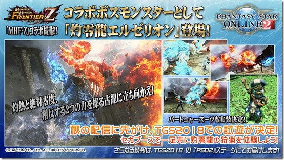Phantasy Star Online 2 is getting Elzelion as part of its upcoming collaboration with Monster Hunter Frontier Z. Elzelion is an Elder Dragon that wields both the powers of fire and ice, and makes this abundantly clear in its design. The collab will also add a Palico as a Partner in the game. A version of the game with Elzelion will be available during TGS 2018 for players to try out, ahead of its release in Fall 2018. Phantasy Star Online 2 is available for PC, PlayStation Vita, PlayStation 4, and Nintendo Switch in Japan and Southeast Asia.