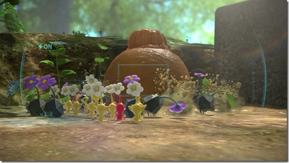 Exploration Day 1 It’s said that, while gardening, Shigeru Miyamoto spotted some ants working together as a group to carry some tree litter back to their nest. The Pikmin series was roughly based on this encounter; although, what I think that what Miyamoto really wanted to do from the beginning was not to imitate the behavior of ants, but to recreate and present the wonder of a world from their perspective. In my six short hours with Pikmin 3 so far, I can see how much energy and care went into making this perspective a humbling one. Moments after crash landing on a seemingly uninhabited planet, I’m standing in a dark cave. Two small, bioluminescent mushrooms occasionally reveal the face of some sort of horrifying creature scurrying around in the shadows. Wait, no—not just one, but six. In the background, the soundscape is so vivid that the echo of the falling water droplets moving between the Wii U GamePad and my T.V. screen often fools me into thinking that my den is, too, a part of the world created by Pikmin 3. And what a world it is.