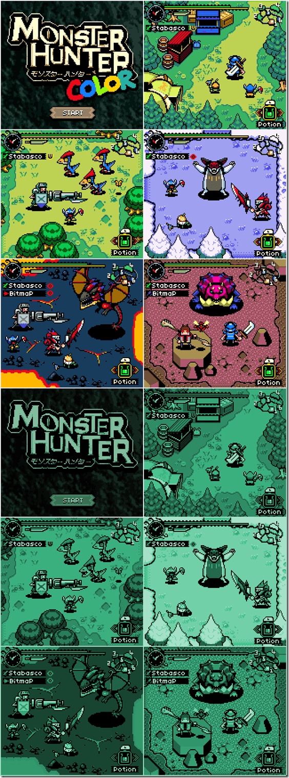Gary Lucken is a pixel artist that loves Dota 2 and Monster Hunter. Back in December, he created a pixel art mockup for a Game Boy Color demake of Monster Hunter, and more recently, in celebration of Monster Hunter 4 Ultimate’s release date, he’s added the new game’s Tetsucabra to the project. Here’s a look: