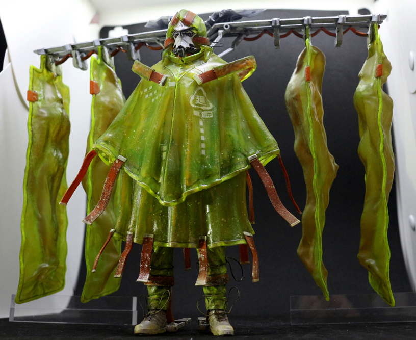 Creator’s comment: “Kai108 is a sci-fi garbage collector. My favorite parts of his design are his fluorescent, transparent coat (so that he and his fellow garbage collectors can see each other, even in low-visibility settings), and the mechanical arm unit on his back that allows him to carry as much as he needs to. I tried to give him a deep-sea-creature-y sort of creep factor. If he bugs you out a little bit, mission accomplished.” [Editor’s Note: Kai looks like he was put together using a Star Wars Stormtrooper helmet, which might explain why he isn’t up for sale.] Platinum Man: Designed and sculpted by Yoshikaze Matsushita Material: Resin Height: Approx. 16 cm / 6 inches Price: 10,000 yen
