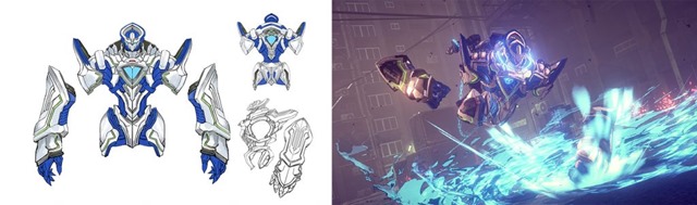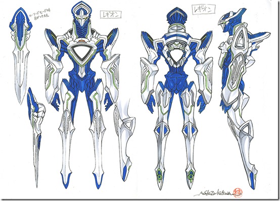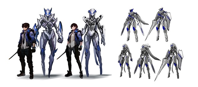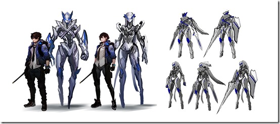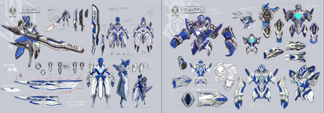 These early drawings are pretty rough, but as you can see, we started with a humanoid Legion. This would reinforce the idea that it was the main character’s partner, rather than just a tamed monster or weapon. We had long, hard talks over how far to take it. Should the Legion have eyes? Should you be able to actually talk with it? This was about when we started experimenting with tokusatsu aesthetics, like you might see in Japanese costumed hero TV shows like Ultraman or Kamen Rider. At this point, the main characters themselves were still in the brainstorming stage. We tried Legion designs that changed based on the player character’s gender. Then we thought of having the Legion take on different “classes” as they leveled up: a stoic paladin if you prioritized defense, a ninja if you focused on speed, and so on.