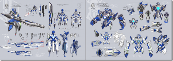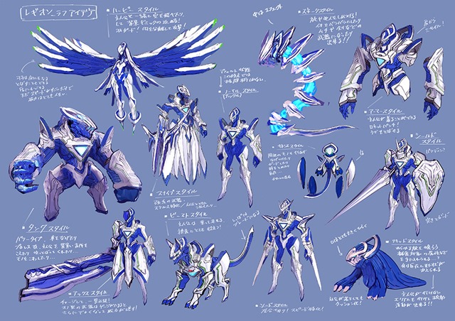 After that, we received that first Sword Legion design that I showed you from Katsura. We thought the details and parts he’d put on the head and shoulders were particularly cool, so we used those as a reference as we continued to brainstorm non-humanoid Legions as well. You can see some of those ideas in the art above.