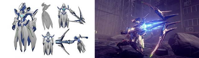 The graceful Arrow Legion hovers in the air without a sound and strikes and enemies from long range. It was originally conceived as a stealthy Legion specialized for infiltration missions. Its giant, bowlike weapon is a major part of its unique silhouette, and I imagined it bullseyeing wave after wave of enemies as I designed it. Its floating parts move with the angle of the bow, to avoid interference with the ground.
