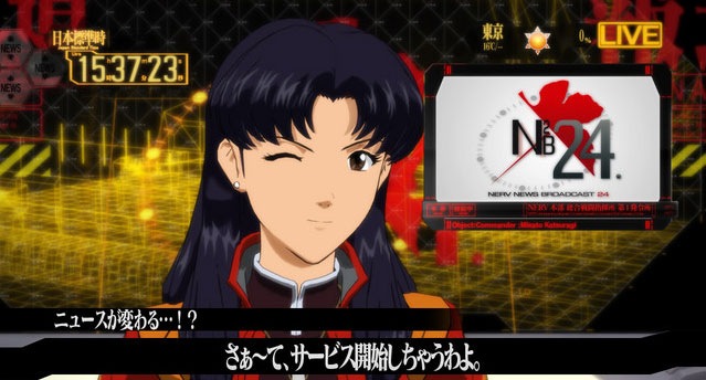 Misato Katsuragi Houdou Keikaku (Misato Katsuragi Report Program) is a PlayStation 3 news brodacast with Nerv’s operations director as the newscaster. The PlayStation Network show pulls news from the Mainichi Shimbun, a major newspaper in Japan, and has Katsuragi read the headlines.