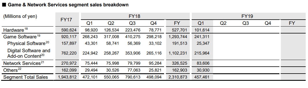 sony1012000 Sony Interactive Entertainment shared the consolidated financial results for the first quarter of the fiscal year with the three months-ended June 30, 2019 with updated PS4 hardware shipment numbers.   2019-07-30_020718 The PlayStation 4 console sold 3.2 million units in Q1 of FY19, or the first three months of the fiscal year of 2019. That’s about the same amount it sold during the same period last year. In the last quarter the PS4 reached 96.8 million so with the added 3.2 million it now sits at a clean 100 million.   In full game software sales going from 40.6 million to 42.9 million. The ratio of digital game download sales of full game software have also risen significantly. In the first quarter of FY18 43% of all full game software were sold digitally, but in the first quarter of FY19 the ration has gone up to 53% in favor of digital.   2019-07-30_021428 You can check out a more detailed breakdown of the game & networks services segment in the above chart.   2019-07-30_021609 As for PlayStation Plus subscribers, numbers have been up since Q3 FY18 and didn’t seem to drop too much by Q1 FY19 with 36.2 million subscribers.   Lastly, Sony previously forecasted about 16 million units of PS4 consoles sold by March 31, 2019, but this has been brought down a million to 15 million in the company’s updated forecast.   The PlayStation 4 first released in November 2013 in North America and Europe, followed by a Japanese launch in February 2014.