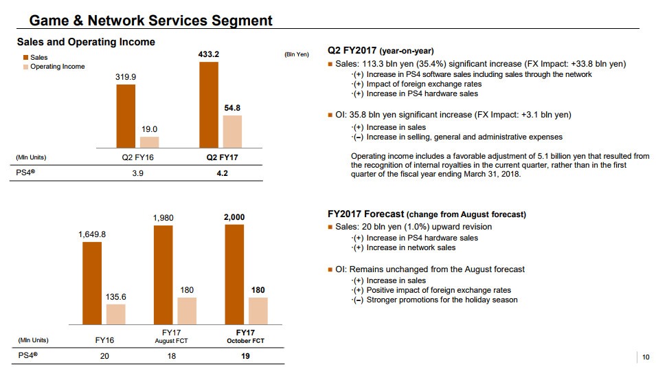 Sales increased 35.4% year-on-year (a 25% increase on a constant currency basis) to 433.2 billion yen. This significant increase was primarily due to an increase in PlayStation®4 (“PS4”) software sales including sales through the network, the impact of foreign exchange rates, as well as an increase in PS4 hardware sales.