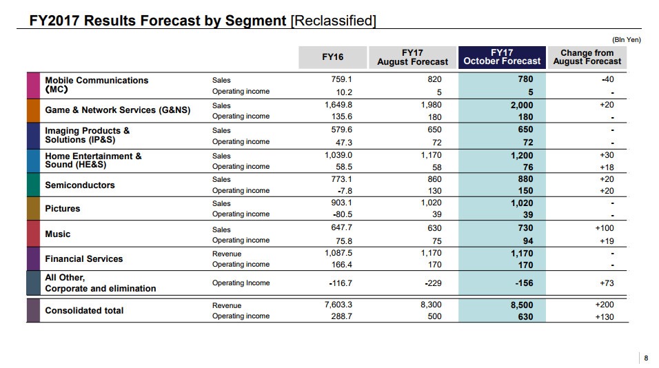 The above chart provides an updated list of forecasts. Previously, Sony expected to sell 18 million PlayStation 4 units before the fiscal year ending March 31, 2018, but this has been revised to 19 million. In the second quarter of the current fiscal year, Sony shipped out 4.2 million PlayStation 4 units to retailers, putting the console’s total sales at 67.5 million.