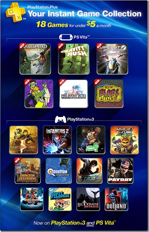 PlayStation Plus, Sony’s paid PSN subscription that yields discounts and other benefits to users, is being extended to the PlayStation Vita. This morning, Sony announced that a PlayStation Vita 2.00 firmware update on November 19th will bring the “Plus” service to the device, and that it will kick off with an “Instant Game Collection” service that gets you the following games for free: Uncharted: Golden Abyss Jet Set Radio HD WipEout 2048 Gravity Rush Tales From Space: Mutant Blobs Attack! Final Fantasy Tactics: The War of the Lions (PSP game) If you own a PlayStation 3 and are already a PlayStation Plus subscriber, your PlayStation Plus service will be extended to your Vita at no extra cost. You will be able to choose between the two subscription options—a three-month plan for $17.99 and a one-year plan for $49.99. Meanwhile, details for the European PlayStation Plus service, which will hit Vita on November 21st, can be found here. ![]()