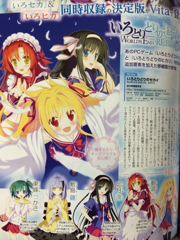 Irotoridori no Sekai: World’s End Complete originally released on PC in August 2012, as an 18-and-above adult title. A less naughty version of the game will be ported to PlayStation Vita as Irotoridori no Sekai: World’s End Re:Birth. [Thanks, Zaregoto.] The protagonist of the game has the power of “Translucent Magician” that allows him to touch someone to cure all of their wounds. However, the catch is that he pays the price by losing some of his memories in order to use this ability. Irotoridori no Sekai will have you traveling between the real world and a different world as part of a fantasy story that involves finding things the protagonist has lost in addition to helping out the heroines and their problems. The game will also include content from the Irotoridori no Hikari fan disc, in addition to added scenario and graphics by the original staff. Irotoridori no Sekai: World’s End Re:Birth will release in 2015 for PlayStation Vita.