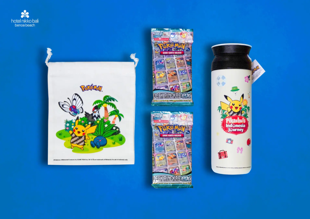 NEWT has also shared an image showing the bonus items that people can get for staying in the rooms. In addition to a tumbler and purse with unique Pokemon designs, they will also receive two starter decks from the Indonesian language version of the Pokemon Trading Card Game.