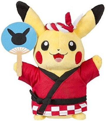 The Pokemon Center has been regularly rolling out new Pikachu Celebration plushes, stuff toys originally released month-by-month in Pokemon Centers in Japan. There’s a bit of a delay involved, which is why the July 2015 design is showing up in the online store now. Summer Festival Pikachu, originally Omatsuri Pikachu, is now available.