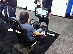 Amongst other things, Masuda excitedly expressed how impressed he was by a sit-in Lamborghini racing game controller at a peripherals booth. It appears Masuda’s a fan of Lamborghinis. Another racing game station with three screens caught his interest, too.