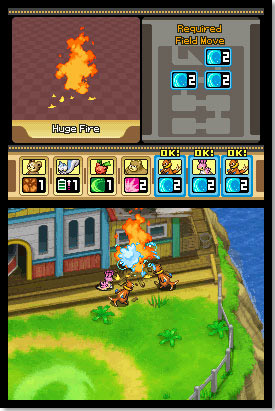 After you’ve captured the Pokémon, they follow you around until you need them to perform some task on the field. As you journey through the dungeons and fields, sometimes there are obstacles that need to be removed. Other times, there are rare Pokémon hiding in a nearby tree or pretending to be an inanimate object. Each Pokémon in this game has an ability they can use (Slash, Slam, Flame, etc.) that affects the overworld obstacles. You can tell which abilities you need by clicking on said obstacle, and you destroy it by pointing to the Pokémon and dragging it to the object in question. For example, if there were a giant log that needed to be slashed, I could drag an Ivysaur over and he’d slash the thing to bits. After his job is done, he leaves the party.