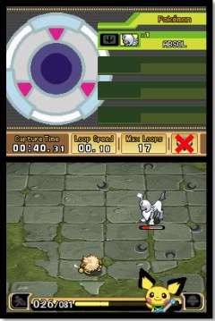 As in previous games, Pokémon are captured by drawing circles around them. At first, it seems simple, but it actually becomes a frenzy of circle-drawing with a very healthy helping of good timing and some strategy quite soon into the game. First, each Pokémon has an “HP” gauge, which displays how close you are to capturing the Pokémon. As you draw more circles, the gauge fills with yellow. Sometimes, the Pokémon will suddenly become enraged, at which point the gauge is completely filled with red and every circle you draw detracts a smidgen from the bar. Once it’s emptied, the gauge turns yellow again and you start at where you left off.