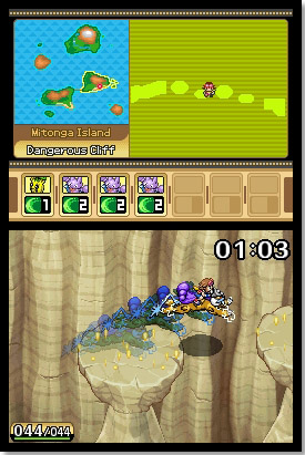 However, while which Pokémon you use doesn’t matter on the field, the usefulness of each Pokémon in battle is heavily determined by the type of attack he has. Although both Pokémon have the field assist Break, Ramparados causes a gigantic avalanche in a square area in front of it, while Mankey only directly attacks what’s in front of it before collapsing, panting, on the screen – and thus leaving him very open for an attack. Sometimes, a Pokémon will have a handy ability that helps with capture, too, like Buizel, who has a water attack that inflicts Slow.