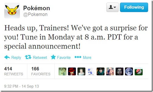 On Monday, September 16th, The Pokémon Company will be making some sort of a surprise “special announcement,” which they teased over Twitter this morning. No further hints have been made as to whether this announcement will pertain to the Pokémon X and Pokémon Y games or whether it will have to do with something else.