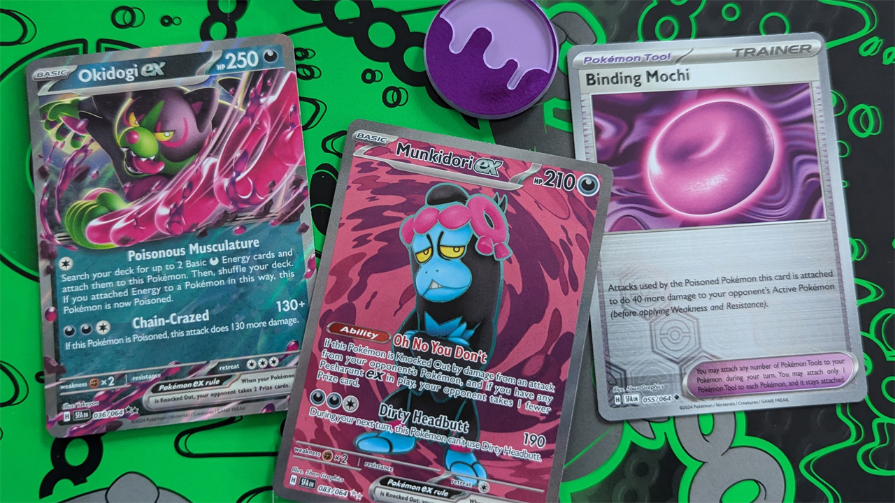 So first? Yeah, Pecharunt and the Loyal Three are here. Base versions of the Three showed up in Twilight Masquerade, so the ones here are all about being poisoned and mind-controlled by Pecharunt. Okidogi poisons itself to power up. Munkidori delivers ex-level strength but only offers one Prize when it falls. Fezandipiti watches on and offers card draw when the opponent downs its teammates. Meanwhile, Pecharunt manipulates from the shadows, switching out its team for free with poisonous side effects.