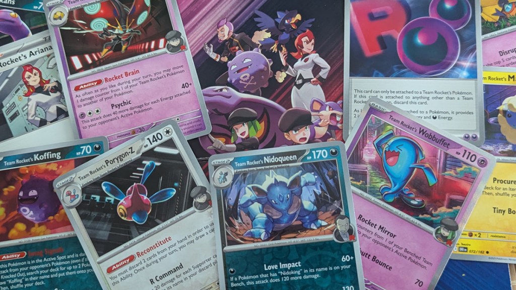 There are 11 Team Rocket Trainer cards in the set, most with effects that you’re used to, but slightly better with the faction restriction. The Stadium lets you draw two cards a turn, offering the foe nothing unless it’s a mirror match. Its Great Ball always catches something, but evolution or basic is a coin flip. Its dedicated Transceiver lets you choose which one of these you want from your deck. Our favorite combo, though? That’s Team Rocket’s Wobbuffet and Orbeetle. Orbeetle lets you move around damage counters at will, while Wobbuffet’s attack transfers counters from one bench creature to the opponent.