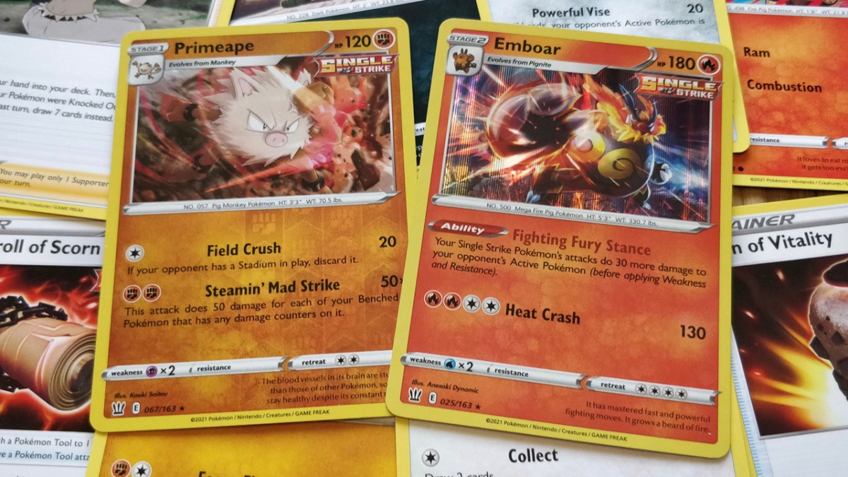 Battle Styles’ Single Strike team also includes Tyranitar, Houndoom, Mawile, Primeape, Stonjourner and Emboar. You’ll generally be loading a bunch of energy onto a creature and discarding it for a huge burst, or using attacks that can’t be picked twice in a row. The advantage here is the sheer damage output against foes like other Pokemon V, and you only need to take out a few of those to win. Meanwhile, the Rapid Strike team requires a bit more strategy. Octillery, Empoleon, Falinks, Mienshao, Carnivine and Luxray anchor this squad. The whole crew loves it when you swap out active Pokemon, either yours or your opponent’s. It’s a good thing, then, that Escape Rope is back in this set! Rapid Strike cards want to spread out the damage and keep the pressure up, accepting a few losses here and there as you stick and move. Each faction has special energy cards, supporters and stadiums to support their strategy. Even if they’re not tuned for tournament play, using the two against each other feels like an anime-style battle with dramatic twists and sudden counters. It fits! It isn’t a set for everyone, but it’s a fun change of pace for a card game that has outlived countless others. The Pokemon Trading Card Game Battle Styles expansion is bound for stores now, following the recent release of Shining Fates. (You might have trouble finding it in stock!) The official release date (and debut in Pokemon Trading Card Game Online) is March 19, 2021.
