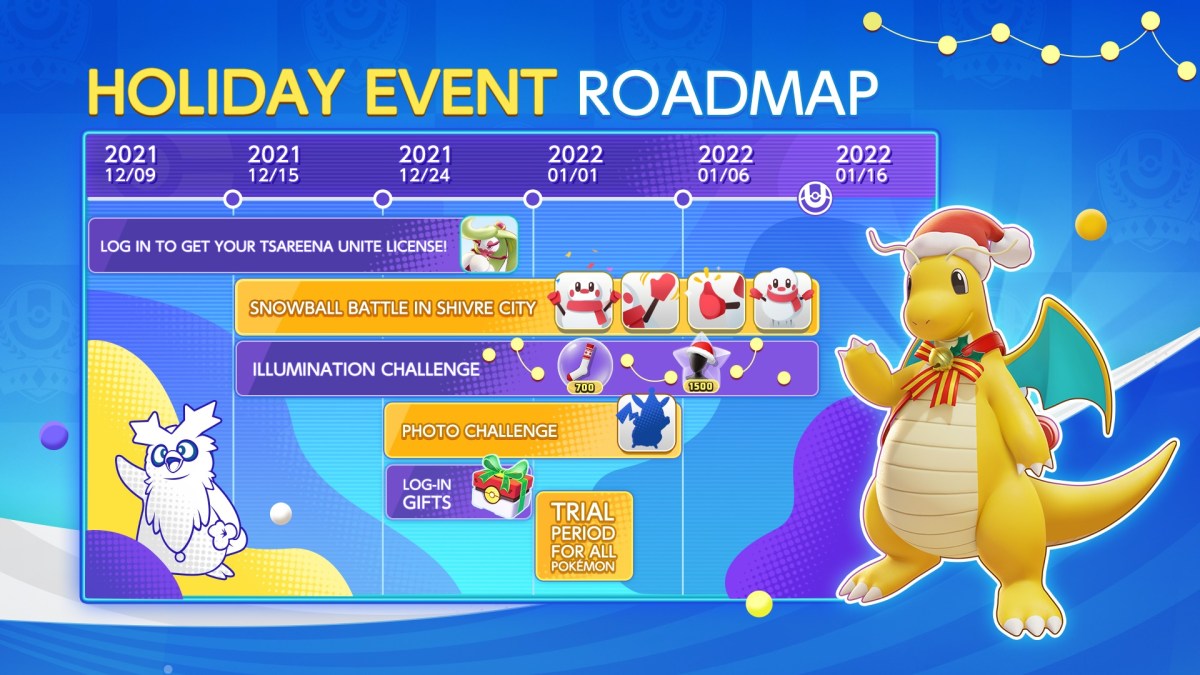 There’s a new Pokemon Unite roadmap and it not only shows the upcoming Holiday event, but Dragonite as well. Things kick off with Tsareena’s debut in December 9, 2021. Then, the Holiday event follows on December 15, 2021. From there, people can get Dragonite on December 20, 2021 and start seeing additional events. First, the new playable Pokemon Unite character Tsareena will be temporarily free. People who log in before December 31, 2021 will get their Unite License. This will be permanently yours and let you use them in battles. The next addition is the Holiday event. That will run December 15, 2021 to January 16, 2022. As part of it, there will be special matches, customization items for Pokemon and trainers, Challenge missions, and Shivre City Quick Battle Snowball Battle. You can complete challenge and daily missions to light up trees in the hub. The lights also get you fashion items and 1-Day Limited Licenses for Alolan Ninetails. The Snowball Battle will feature Articuno in the central area and Delibirds to defeat for temporary one-use battle items. Also, in that mode defeated Pokemon turn into temporary snowpeople. More parts of the Pokemon Unite Holiday event start after December 24, 2021. There will be a login event with rewards until January 1, 2022. You can also participate in a Photo Challenge. If you go through standard, ranked, quick battles, and Snowball Battles, you’ll get snowflakes. Those can be used for images. That will be around until January 6, 2022. Finally, January 1-3, 2022, every Pokemon in-game can be used by every player. Here’s the picture of the December 2021 and January 2022 Pokemon Unite roadmap.