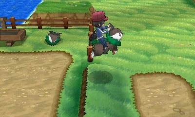 That’s riding in a nutshell. The actual new mode of transporation is the roller skates. The skates are are used by employing the 3DS Circle Pad for movement, instead of the D-Pad. They’re a fairly fast way to travel around in style, and if you are so inclined, you can even dash or perform tricks like a back flip or a 360 upon landing after a ledge. Some places have rails where you can approach and skid down to reach different areas. The skates are incredibly smooth and fun to use—with the only problem being that sometimes they’re a bit too fast and smooth, so much so that turning in a specific direction to talk to NPCs or trying to head into a door can be difficult. That said, the ease with which you can switch between skates and regular running is easy. Want to skate? Use the Circle Pad. Want to run? Use the D-Pad + B. Some areas won’t allow skating, though, such as houses or nature preserves, so in those areas you can use the Circle simply Pad to run. Finally, if you prefer to travel even faster, you can use the bicycle, which is back again. This is much more familiar to Pokémon veterans, so there isn’t much to say about it, except that it’s faster than skating. It’s also the only mode of transportation that allows you to move quickly through grass, since the skates get tangled and you end up walking when you hit tall grass anyway.