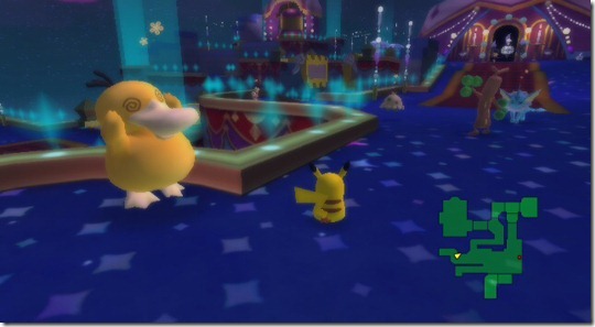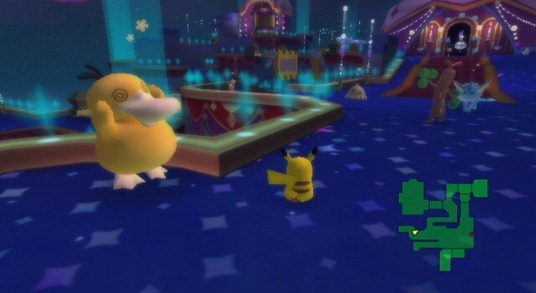 It’s to this image of tranquility that Pikachu arrives with his friend, Piplup (for the sake of convenience, Pikachu’s a male in this article). The two are enjoying their vacation when they hear of a new attraction called Wish Park. Pikachu and Piplup, joined by a curious Oshawott, enter, lured by the enticing offer of free cake and fun attractions. True, the attraction is fun, and they have a great time, but the cake is a lie and before long, they find that all the Pokémon who’ve feasted have become dopey and swirly-eyed.