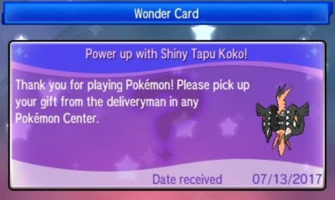A new giveaway is now available for Pokémon Sun and Pokémon Moon in North America and Europe. Players can pick up their very own shiny Tapu Koko by connecting to the internet and selecting the game’s Mystery Gift option. [Thanks, Serebii.] The Shiny Tapu Koko will arrive at level 60 with the Ability Electric Surge and the moves Nature’s Madness, Discharge, Agility and Electro Ball. Pokémon Sun and Pokémon Moon are available for the Nintendo 3DS.