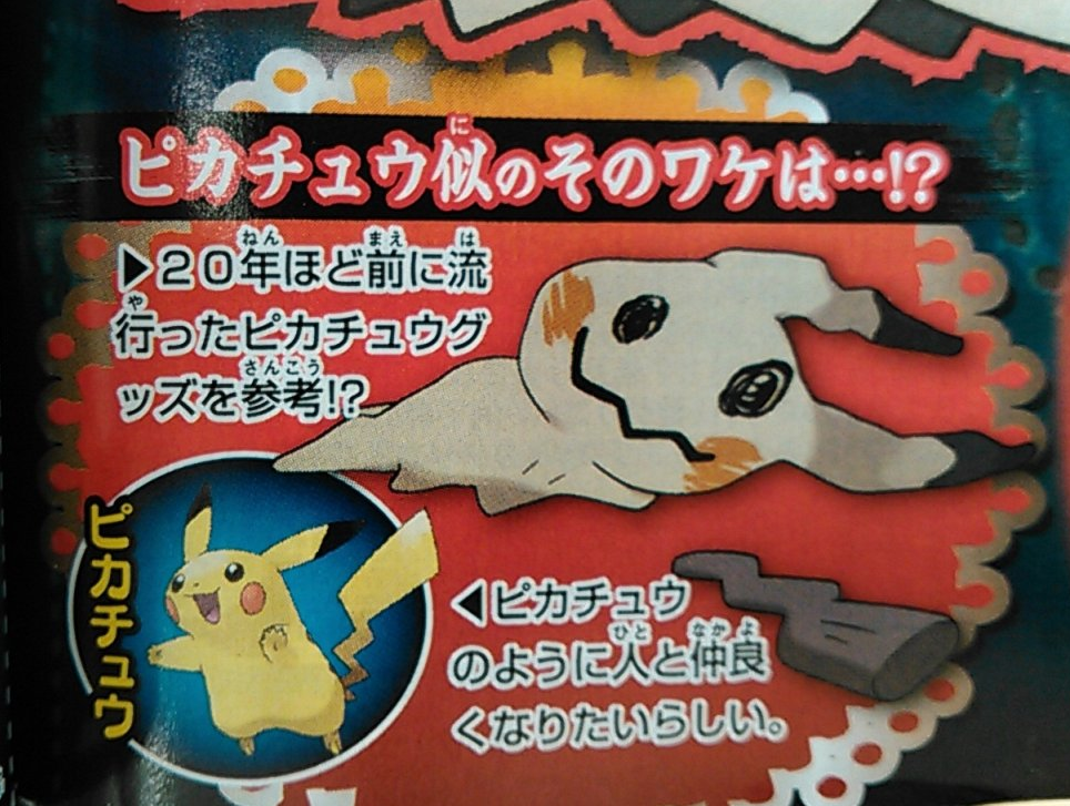 Next up is Mimikkyu, a Ghost/Fairy Pokémon. It has an ability called “Disguise.” If you’re wondering why it has an eerie resemblance to Pikachu, it’s actually wearing some sort of Pikachu goodie that was popular 20 years prior. And the reason for that is because it wishes to be friendly with humans just like Pikachu.