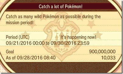 Pokémon Sun & Moon’s first Global Missions is now underway, and players have until December 12th at 23:59 UTC to catch 100 million Pokémon. To take part in this Global Mission, you must have connected your game to the Global Link and then speak to the woman at the desk in Festival Plaza’s castle. [Thanks, Serebii.] If all players participating capture a the goal of a total 100 million Pokémon, then everyone who took part will receive up to 2,000 Festival Coins. However, if the goal is not met, then all the players will obtain at least 100 Festival Coins.