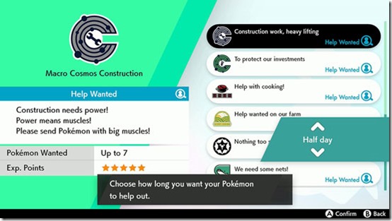 Each Poké Job listing will offer some information. You can see what kinds of Pokémon would be needed, find out what the experience point reward would be, see how many you could send, and determine how long your creatures will be there working. They’ll go straight from your boxes to the gig. When they get back, they’ll have acquired experience, base points, and perhaps even items.