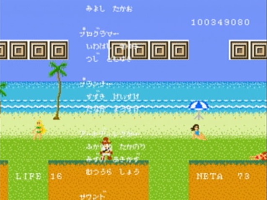 If you miss one aggravating joke you can beat Pole’s Big Adventure under an hour. However, the point of Pole’s Big Adventure isn’t “beating” the game’s six worlds and rescuing Sharon who starts out as a woman, but eventually morphs into other things like a dog wearing a striped sweater and a burly man. The real “goal” (and I use that term loosely) of the game is to collect 100 jokes hidden in the levels. Did you see gameplay videos where text flies on screen and an announcer steps in to explain the gag? Those segments look like they are edited into the trailer when they are really part of the game. When you reach a gag text pops on the screen and an announcer talks, in Japanese of course, out of your TV speakers or Wii Remote.