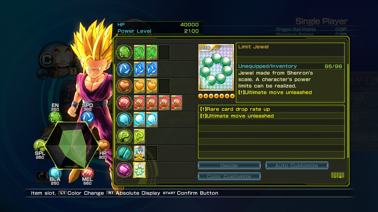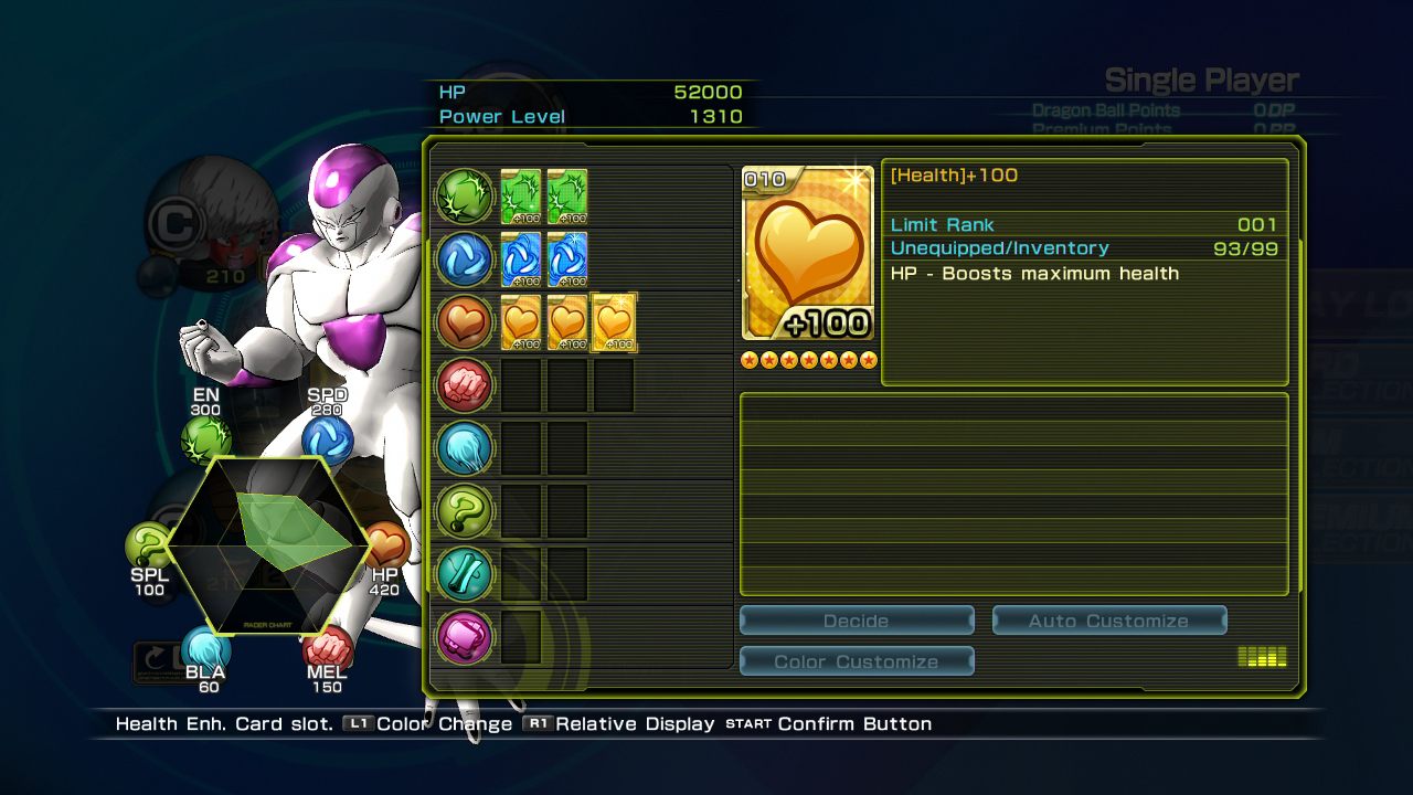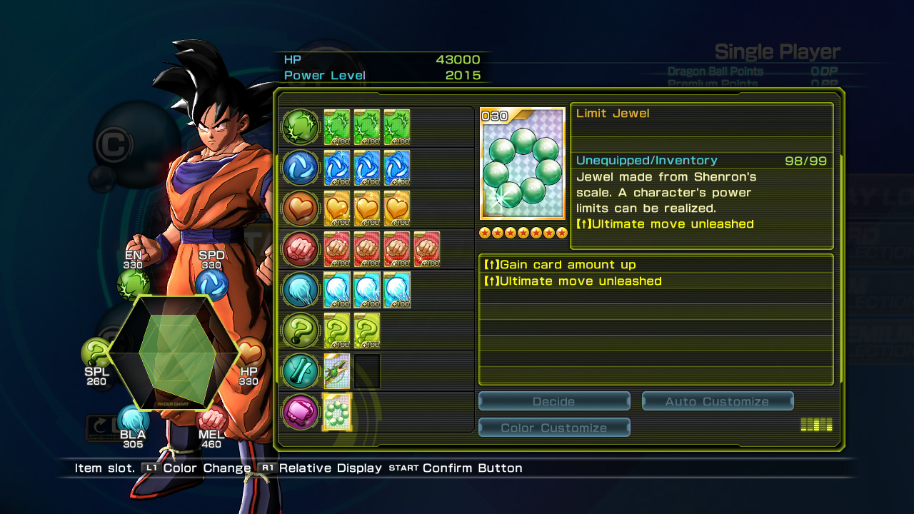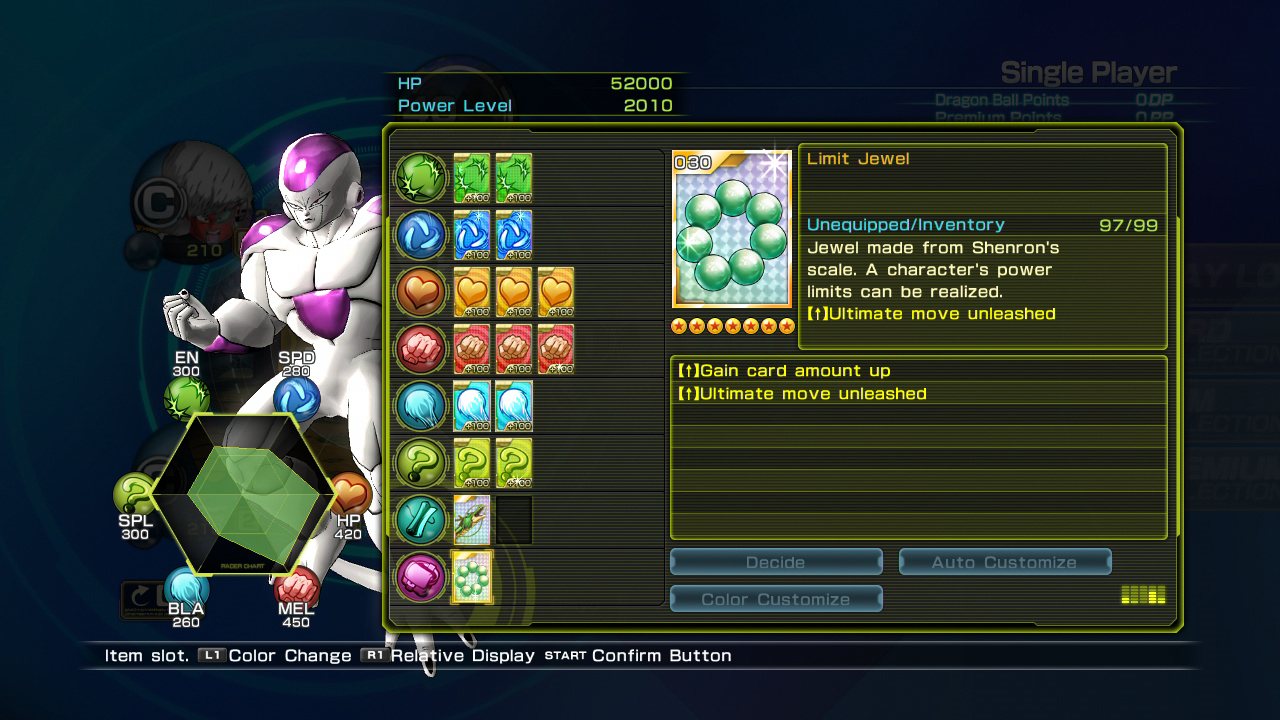 Players can customize characters by equipping cards that boosts attack power, life or energy recovery. Characters can also equip a Limit Jewel that enables their ultimate move and while it won’t make you a more effective fighter, Dragon Ball Z: Battle of Z also has a color customization feature just in case you want to paint Frieza green.