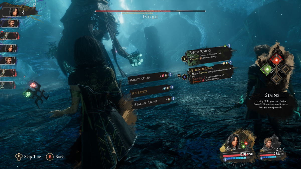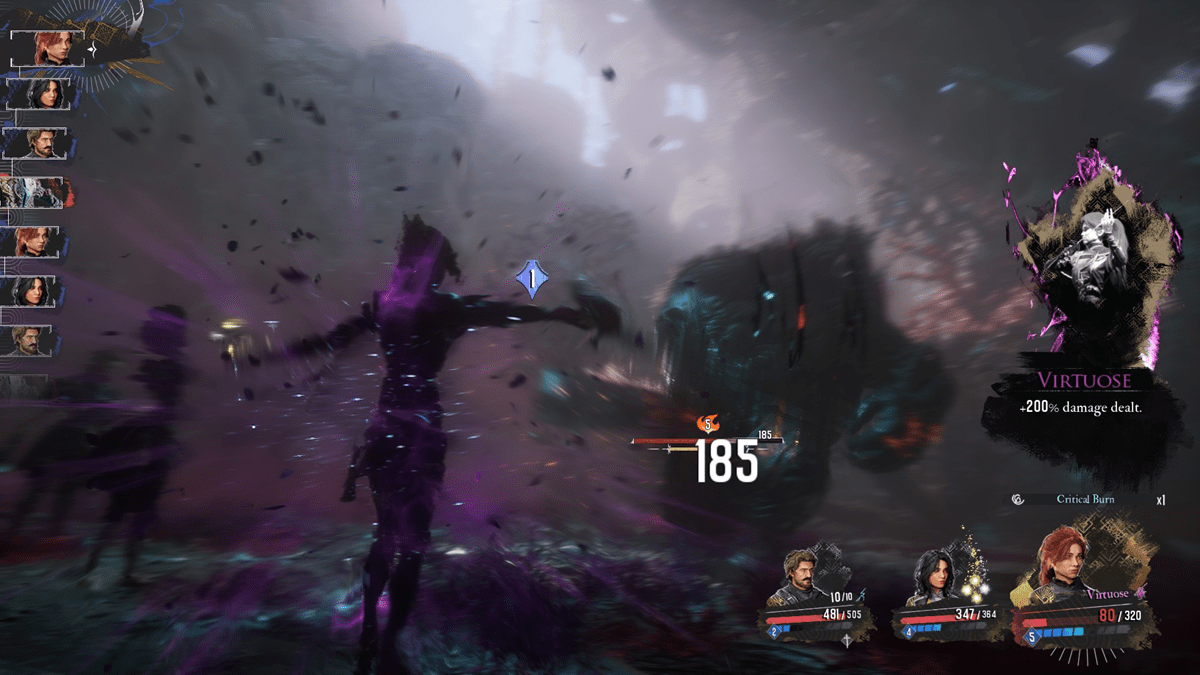 However, the main focus of Clair Obscur: Expedition 33 is in its combat, which puts great emphasis in creating combo opportunities between characters in the party. The max party size seems to be 3 which felt perfectly balanced. As part of the demo, I was able to play as Gustave, Lune, and eventually Maelle. Gustave is a frontliner that fights with a sword and pistol. He has a mechanical arm that can store energy and unleash it with an ability that scales off of it, dealing massive amounts of damage. Almost every action that Gustave takes gives him a charge of his arm. Meanwhile, Luna is a magic adept character that can store up to 4 elemental “stains” obtained from the skills she casts. Each skill can in turn be powered or have its effects changed with stains, making for a very flexible casting system that rewards smart use of skills, but never punishes you for not being the most optimal.