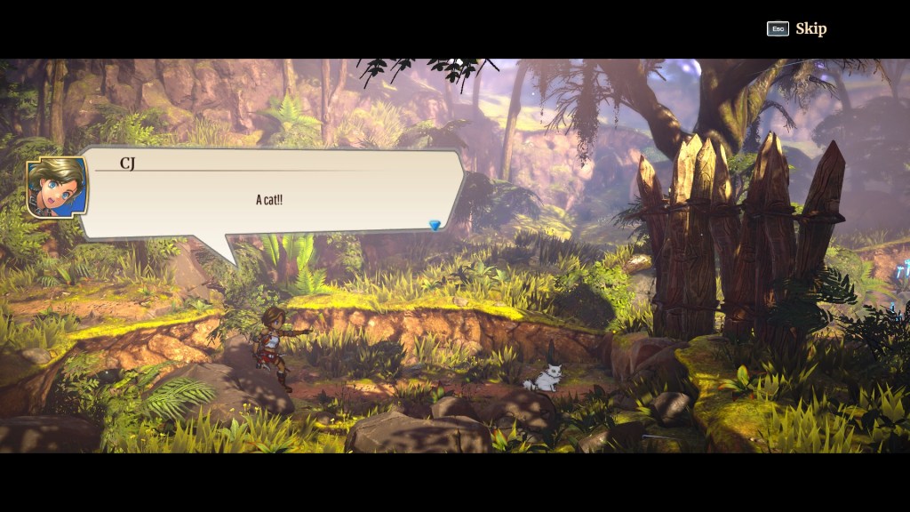 What really helps Eiyuden Chronicle: Rising after starting is how it works to establish its characters. We meet CJ right off, and get a sense of her determination and personality. She’s extremely eager, and her turn of phrase helps establish her casual nature. We get an idea of the trader Hogan’s resourcefulness, as well as his frustration dealing with bandits and Isha, shortly after meeting him. Likewise, Squash the accessory shop owner and artifact appraiser and he both help establish Isha’s attitude before we meet her. (You will know the meaning of the word “rapacious” by the end of the introduction.) However, locals portray Isha and her plans in a different way, with the stamp card offer being a means to help the needy in town while getting prospective adventurers to do their part in an unexpected way. Before we even know Garoo’s name, we know his reputation as a warrior and that his presence is helping to keep the town safe. (Even if it also comes at a price.) Likewise, that pacing extends to the quests. It begins with the lowest of stakes. That is to say, you go looking for a lost cat in the first dungeon, The Great Forest. But eventually, as CJ proves herself, you get to do more and explore more. You’ll get an axe to help gather wood to build a house, teaching you about resource acquisition in the process. Another main quest involves learning more about signposts and how to deal with dungeon bosses.