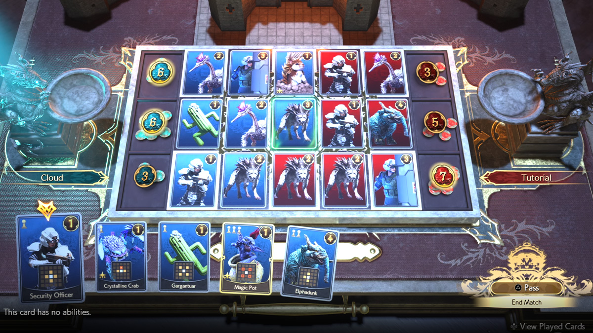 Witcher 3 fans that love Gwent will rejoice, as another major feature added to Final Fantasy VII Rebirth is a new card game called Queen’s Blood. The game is designed around a board with three lanes moving from left to right. In my play session, I had a deck of cards with various characters in. The way the game works is you have to place a card down that matches the rank level of the open spaces on your board. To start the match, you need to place a level 1 card down, as all the spaces start out at level 1. However, based on each card’s unique pattern, you can change the level of the other open spaces on your board. So, for example, a level 1 card might turn the space diagonal to it to rank 2, which then lets you put down a more powerful card. With each card you set down in your lane, its overall power ranking is higher.